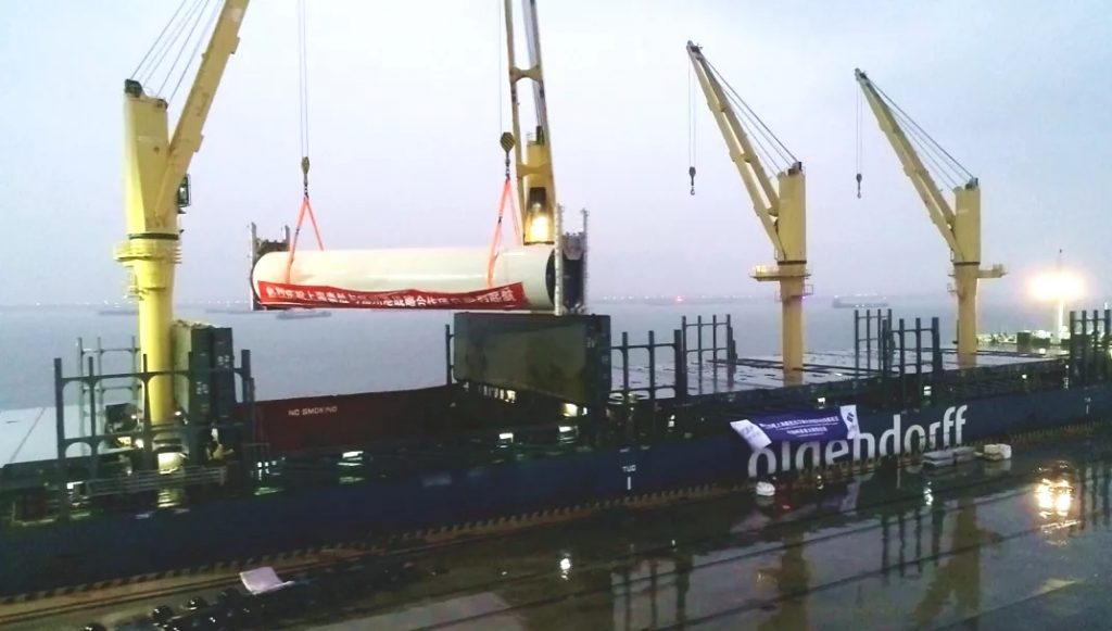 1月27日,小雨紛紛,經(jīng)過(guò)漫長(zhǎng)的等待,“伊麗莎白”輪終于抵達(dá)揚(yáng)州港3#泊位,計(jì)劃裝載16套共計(jì)64段風(fēng)電塔筒出口澳大利亞,這是集團(tuán)首次引進(jìn)的風(fēng)電系列新貨種,也是首次進(jìn)行風(fēng)電塔筒裝船作業(yè)。塔筒貨種的加入,進(jìn)一步豐富了集團(tuán)的貨源結(jié)構(gòu),為新一年港口的強(qiáng)勢(shì)發(fā)展注入了全新動(dòng)能。